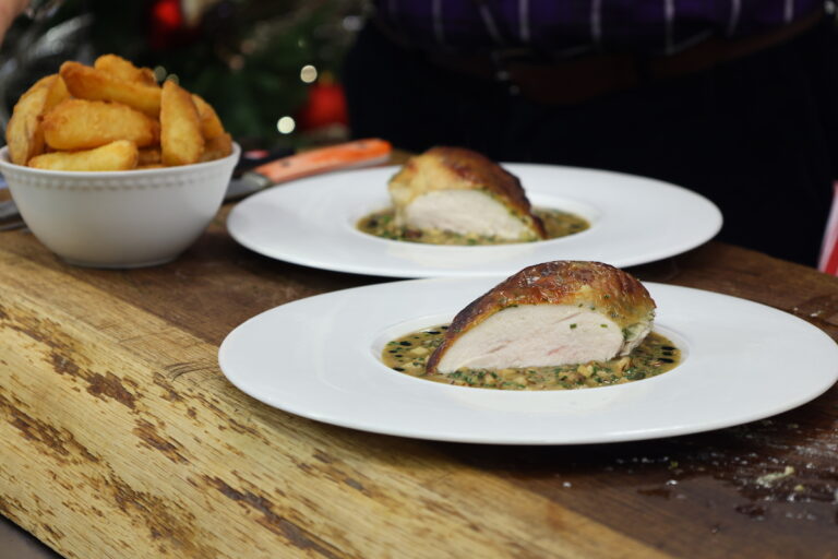 Tender brined Chicken Diane from Lisa Goodwin-Allen. Buttery, herb infused chicken, crispy golden skin, creamy, mustard-spiked Diane sauce and ultra-crispy potato wedges! James Martin