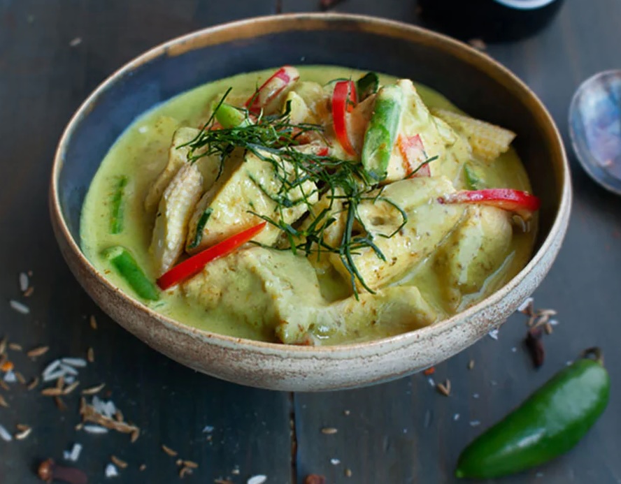 - To make the green curry sauce, place a saucepan over a high heat, then add the coconut milk and reduce by half until split. Add 3½ tablespoons of the green curry paste and cook for 5 minutes until fragrant.
